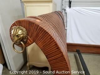 Item Description: Hand made in the Philippines. Headboard and footboard have brass lion heads on the sides. Headboard, footboard, side rails and support rails. Approx. 32" and 46.5" H, 79" W.
