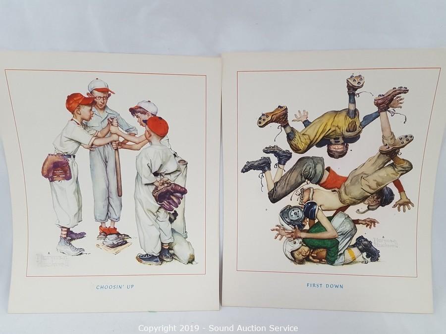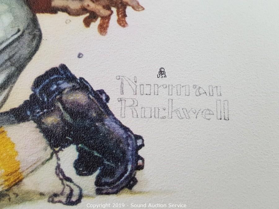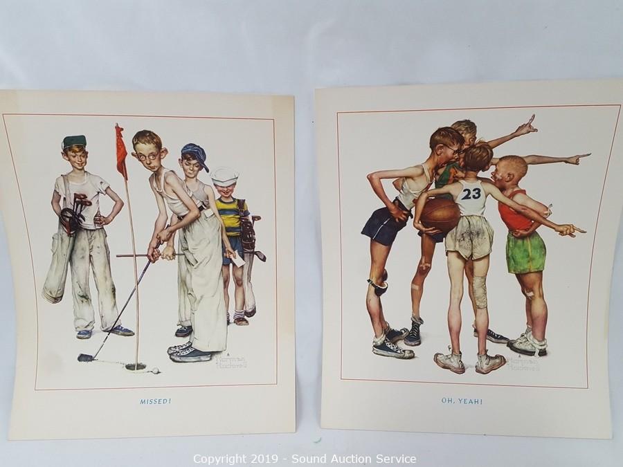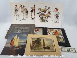 Item Description: 4 Norman Rockwell prints, ship print and photo, scrapbook of old clippings, and Art Treasures from The World's Fair art book.
