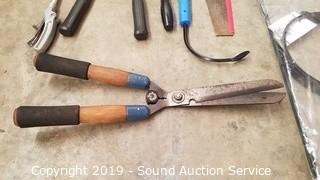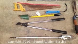 Item Description: Loppers, hand saw, garden cultivator and shovels.
