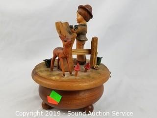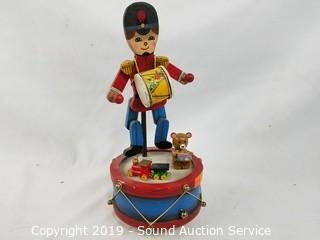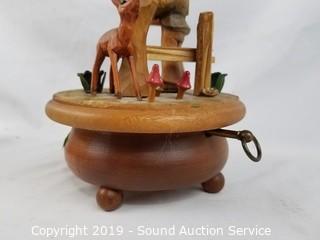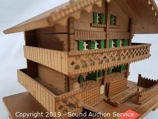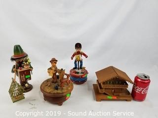 Item Description: German or Swiss. Wood construction. Includes: Man with birdhouse and cage, drummer boy play Parade of the Wooden Soldier by Enesco 1980, Swiss Thorens Carnival of Venice music box, and wooden house music box.