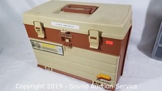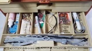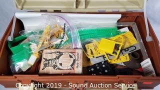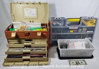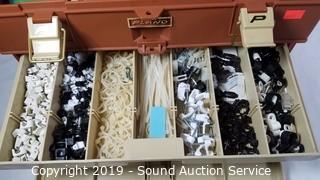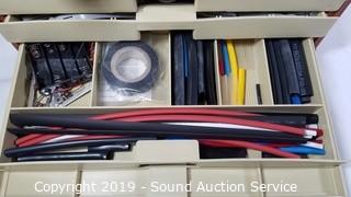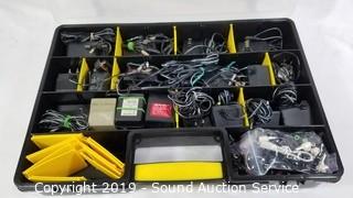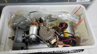 Item Description: Small motors and gearboxes, Plano model 757 tackle box filled with electrical connectors and more and organizer with AC/DC transformers. 4" x 7" x 13" tote, 11" x 15" x 8" tacklebox and 4.5" x 18" x 12" organizer.