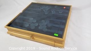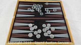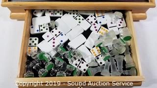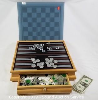 Item Description: Chess, checkers, backgammon, dominoes. Complete. Approx. 3" H, 15 x 15.