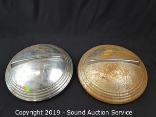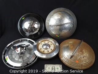 Item Description: Includes 1930s Ford V8 dog-dish hub cap, 2 vtg. Hollywood Flipper dome hub caps, vtg. Chevy hub cap, and vtg. 1960's Ford Fairlane dog-dish hub cap.