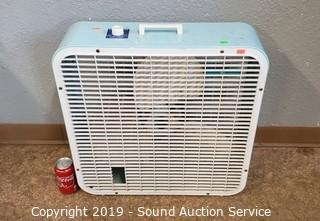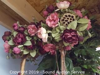 Item Description: Faux Potted Plant & Floral Arrangements, Square Side Table, Vtg. 22" 3-Speed Box Fan and Pair of Decorative Mirrors.