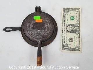 Item Description: Solid cast iron with turned wood handle. Approx 7" x 7".
