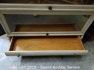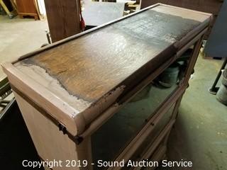 Item Description: Comes apart in sections for easy travel. 50" T x 34" W x 11.5" D. Claw and ball front feet, brass banded. Has a lot of wear on the top.