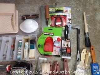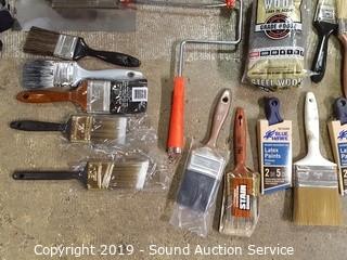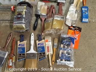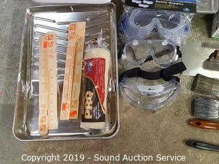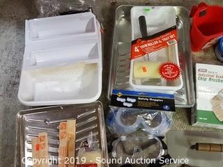 Item Description: Roller pans, goggles, brushes, rollers, stir sticks, face mask, steel wool, masking tape, and more. Many of the brushes are like new.