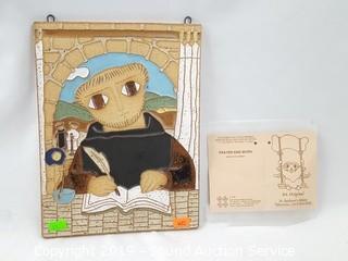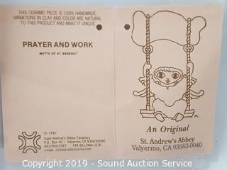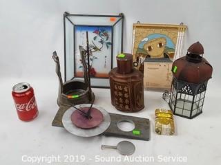 Item Description: Includes quartz pendulum clock Marris Taylor Design (couldn't get it to work), Asian pewter decanter, Sandalwood soap, pottery stand, candle lantern, original St. Andrew's Abbey ceramic tile wall decor and stained glass wall decor.