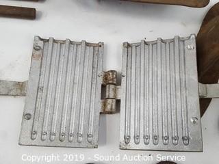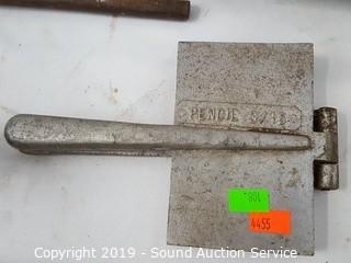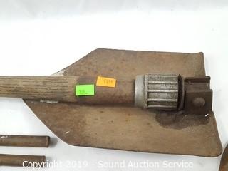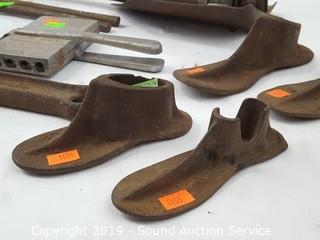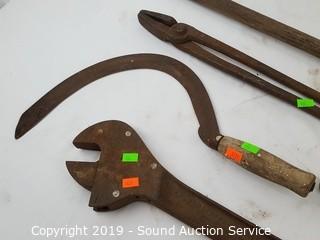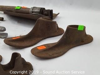 Item Description: Includes a pair of blacksmithing tongs, hand scythe, 4 blacksmithing shoe cobbler anvils (no stands), 3/16" lead pencil mold, trench shovel and large rustic wrench.