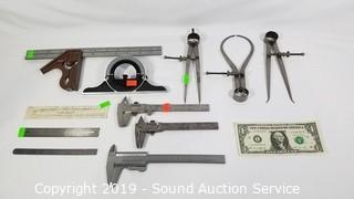 Item Description: Includes calipers, micrometers, Craftsman carpenters square and more.
