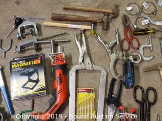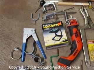 Item Description: Includes Black & Decker 6V reciprocating saw (no DC adapter to test), clamps, hooks, foldable magnifier, precision screwdriver set, metal snips, bionic wrench, multi wrench, tin snips, protractor, ball peen hammer, upholstery hammer, hand drill, laser level and more.