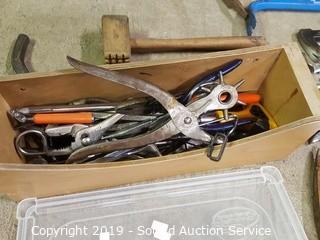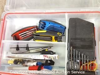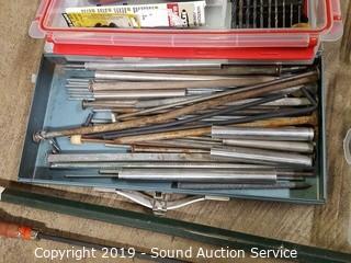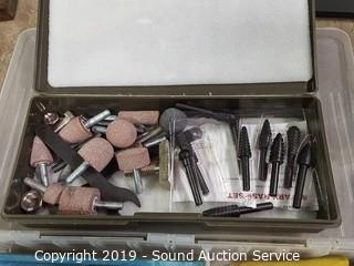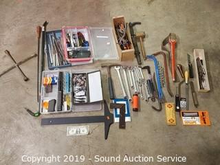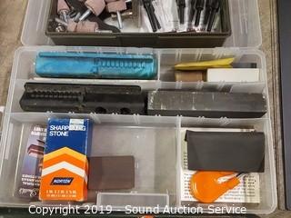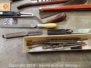 Item Description: Includes various grinding bits, hex keys, drill bits, wrenches, various sharpening and honing stones, carpenters squares, strap wrench, rock pick, pry bars and more.