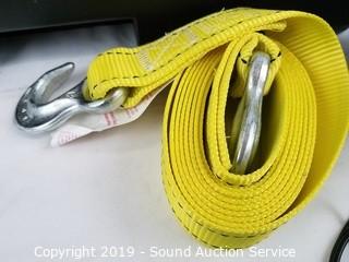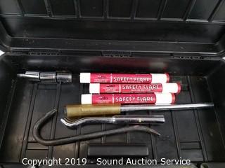 Item Description: Emergency kit has a tow strap, safety flares, Schauer 4Amp battery charger, tire iron with various size sockets, poncho and headlight restore kit. Tote is 4.5" x 10" x 22".