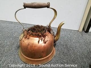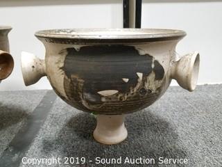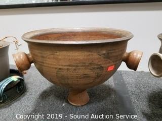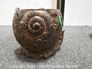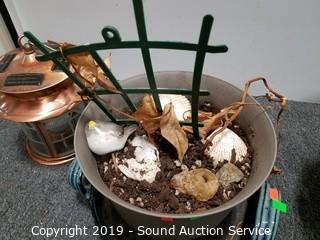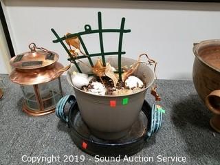 Item Description: 7ft long planter hanger. 2 Pottery planters (9" x 10" and 10" x 11.5"), repurposed teapot planter, copper solar lantern (unknown if it works) and other.