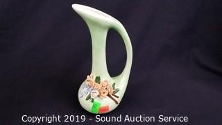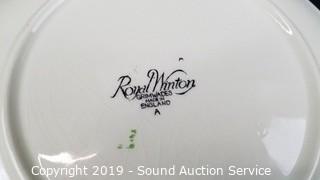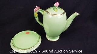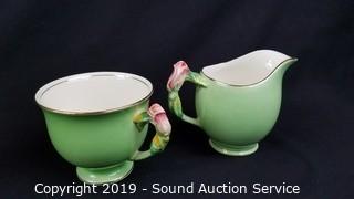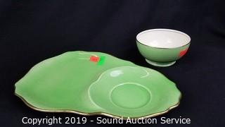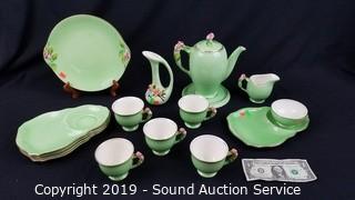 Item Description: 5 cups, cream, sugar, teapot, trivet, 5 saucer plates, plate, and vase.