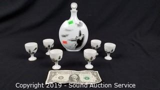 Item Description: Decanter and 6 cups. Stopper has a large chip.