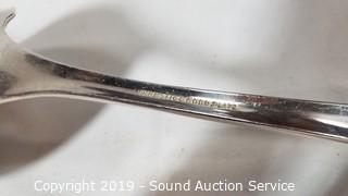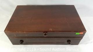 Item Description: 18 butter knives, 18 large forks, 9 small forks, 18 spoons, 4 large serving spoons, 7 serving pieces, polishing cloths. Chest is approx. 6" x 19" x 11".