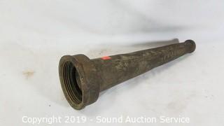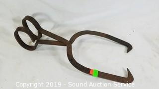 Item Description: Pair of wrought iron ice tongs, 14" fight bell, Rayonier brass hose nozzle, and wooden animal call/whistle.