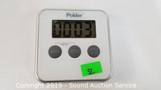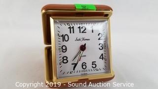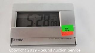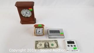 Item Description: Vtg. Seth Thomas wind up travel alarm clock, Versailles Quartz clock, Seiko global radio, and Polder Timer.