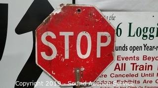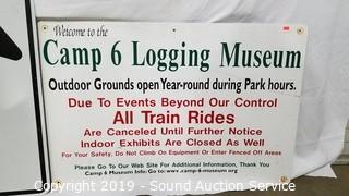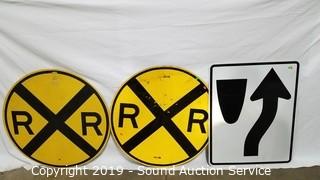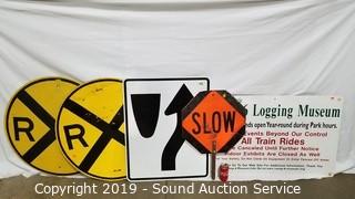 Item Description: 2 round Railroad Crossing signs, Divider Ahead sign, Slow/Stop flagger sign, and Camp Lodging sign.