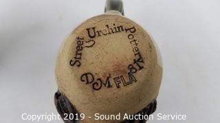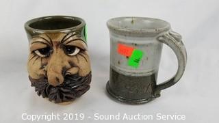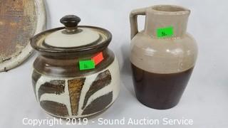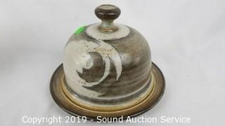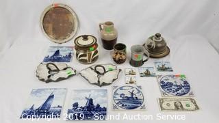 Item Description: Cheese plate with lid, signed mugs "Erchin Pottery" and other, signed cheese dish and pot "Dunlap", 9 Holland delft blue windmill tiles, and 2 sectioned dishes.