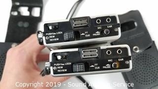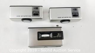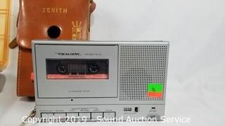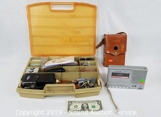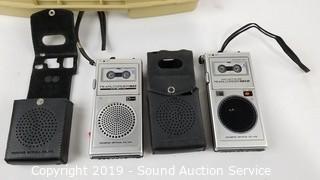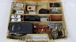Item Description: 2 Pearlcorder's with voice actuator, remote adapter, FM tuner, AM tuner, and other accessories, micro cassettes, leather cases, cords, Realistic cassette recorder, and