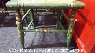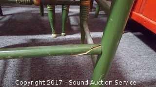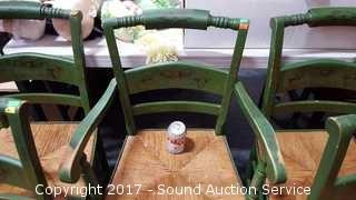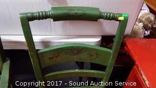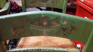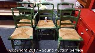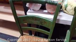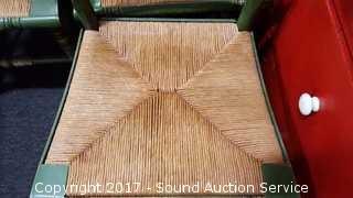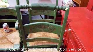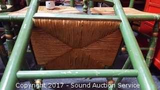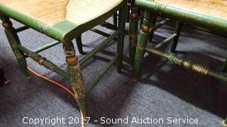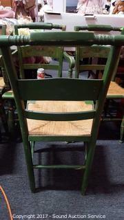 Ladder back, green painted. Rope woven seats. One is a captain's chair. 18" to seat, 17" wide. Has original paint, turned legs.