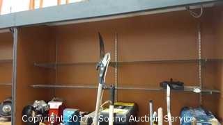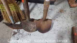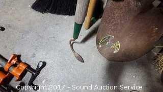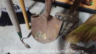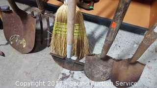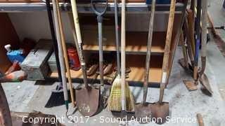 Limb trimmer, shovel, brooms, pitch fork, edger, couple small shovels.
