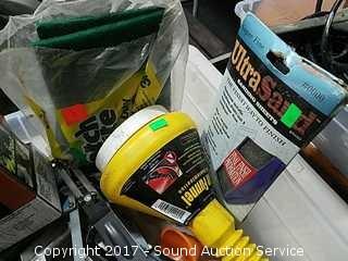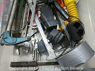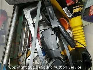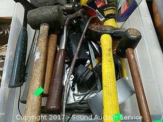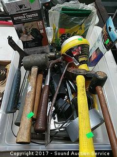 Includes: Hammers, saws, mallets, roofing hammer, hacksaws, NIB work gloves, funnels, duct tape and more.