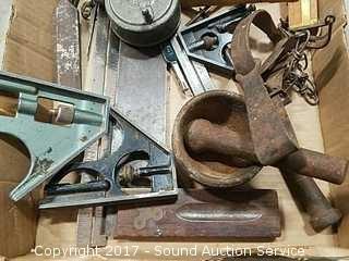 Includes: Iron mortar and pestle, carpenter squares, compass, animal trap, lufton caliper, glass cutting tool, old chalk line and more.