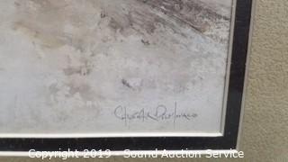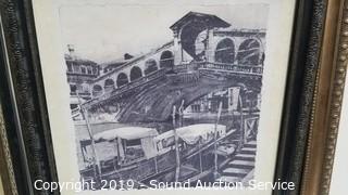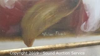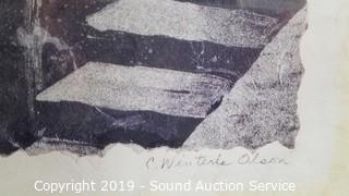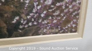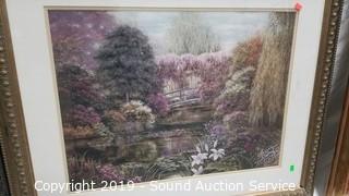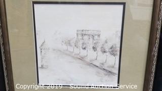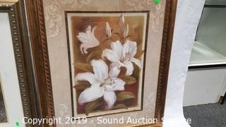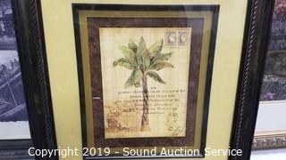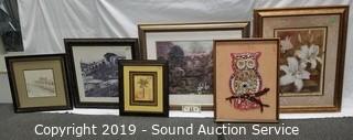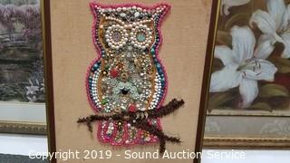 Item Description: Stamp print, architectural, floral and beaded owl artwork. 18" x 16" to 35" x 28.5".
