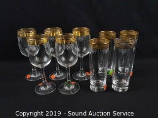 Lot #0209: 9pc Beautiful Gold Leaf Wine & Tumbler Glasses