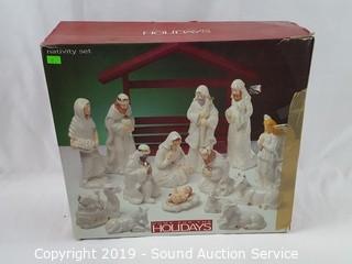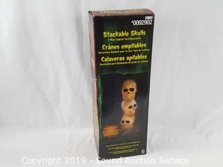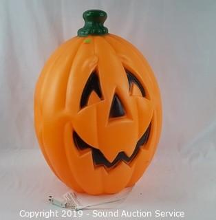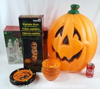 Item Description: Includes stackable skull light, jack-o-lantern (doesn't light up, may need new bulb), 4 plates, 4 bowls and nativity set. Jack-o-lantern is 24" x 16".