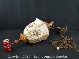 Item Description: Shade is white molded glass with roses, chain is 10 feet long. Extends from the wall 9". 24" x 12" lamp.