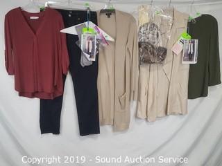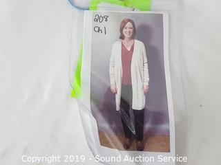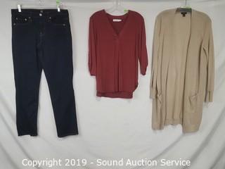 Item Description: Season 2 episode 8. Includes: Lush soft brick red blouse S:M, Halogen oatmeal knit cardigan S:M, GAP dark indigo blue jeans S:31R, Lucky Brand taupe leather boots S:8.5,