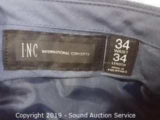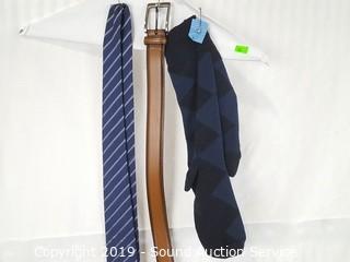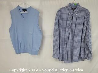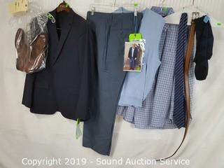 Item Description: Ralph Lauren shirt S:M, Hugo Boss tie, Perry Ellis leather belt S:36, Brookes Brothers pullover sweater vest, Theory navy blue 40R blazer, INC slate grey 34x34 dress slacks,