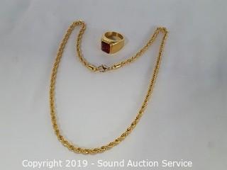 Description Cont. 1: gold tone and ruby ring S:10, and gold tone rope twist chain necklace. Comes with scene information and actor wardrobe photo. All items come from the set of Get Shorty at the conclusion of filming Season 3.