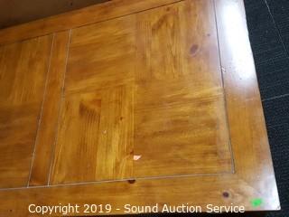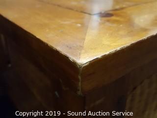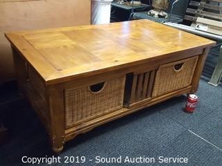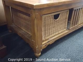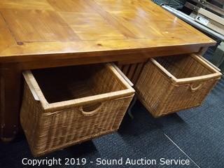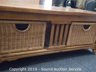 Item Description: Matches the previous lot. Has 2 wicker wove drawers. Appears to be in good condition, some minor scuffs. 19" x 28" x 48".