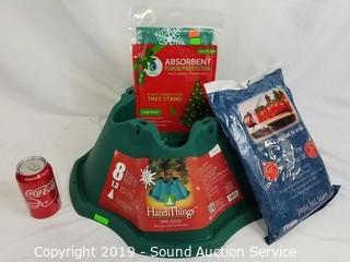 Item Description: All new. 30" diameter absorbent tree skirt. 1.3 gallon capacity stand. Bag holds up to 8ft tree.