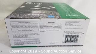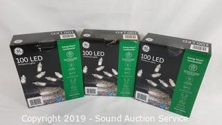 Item Description: 8'ft tree stand, 1.3 gallon capacity, 3 new GE 100 light string lights, 33'ft long can connect up to 25 strings, tree care kit & tree bag.