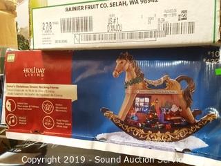 Item Description: Lamp post, string lights, LED spheres, rocking horse, rope light trees, and more. All not working or damaged, parts/repair.