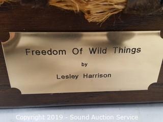 Item Description: Solid wood framed with rope accent, glass & brass plaque with art title and artist. Original image by Lesley Harrison, titled "Freedom of Wild Things", 27" x 33".