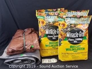 Lot #0355: 4) 3lb Bags Miracle Gro Flower Seeding Mix & Tarps