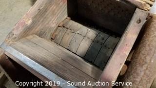 Item Description: Looks like an old corn grinder? Solid wood and steel construction the inner drum is wood with steel teeth. Approx. 12" H x 30" x 27".