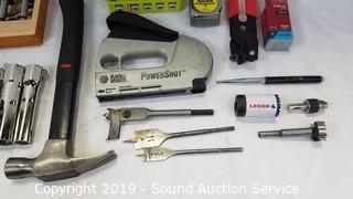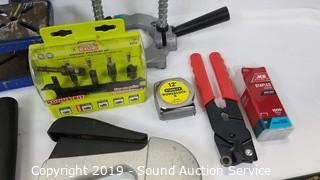 Item Description: Drill guide accessories, 6-3/8" recessed light hole saw, router bit sets, screwdriving bit set, staple gun, carpenters square and more.