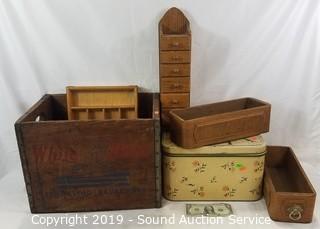 Lot #0169: Vtg. Wooden Crate, Organizer, Tin & More