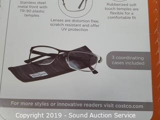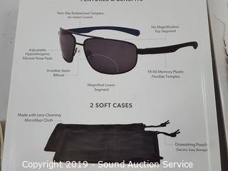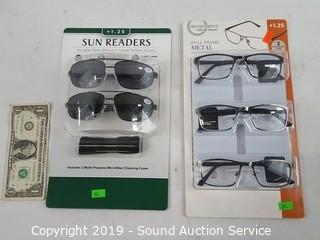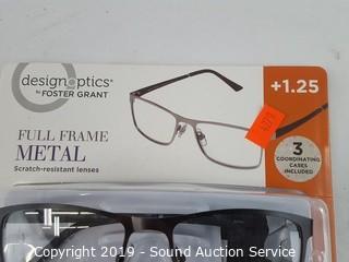 Item Description: 3 pairs Design Optics full frame metal reading glasses with coordinating cases, and 2 pairs Sun Readers bifocal glasses with 2 microfiber cleaning cases.