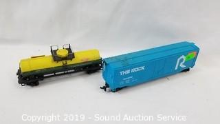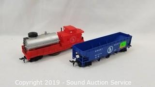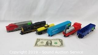 Item Description: Santa Fay engine, The Rock box car, Dupont tanker, Great Northern Railway tank car and hopper car.