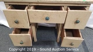 Item Description: Comes with mirror topper, not attached, missing the bottom cross bar to hold mirror in place. Has metal drawer pulls, 5 drawers, top left drawer is missing the bottom.