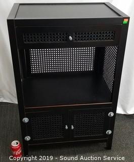 Item Description: Single top drawer, open middle with lower cabinet, cane accents on the sides and front of doors and drawer. 37.5" H x 24.5" W x 16.5" D. In great condition.